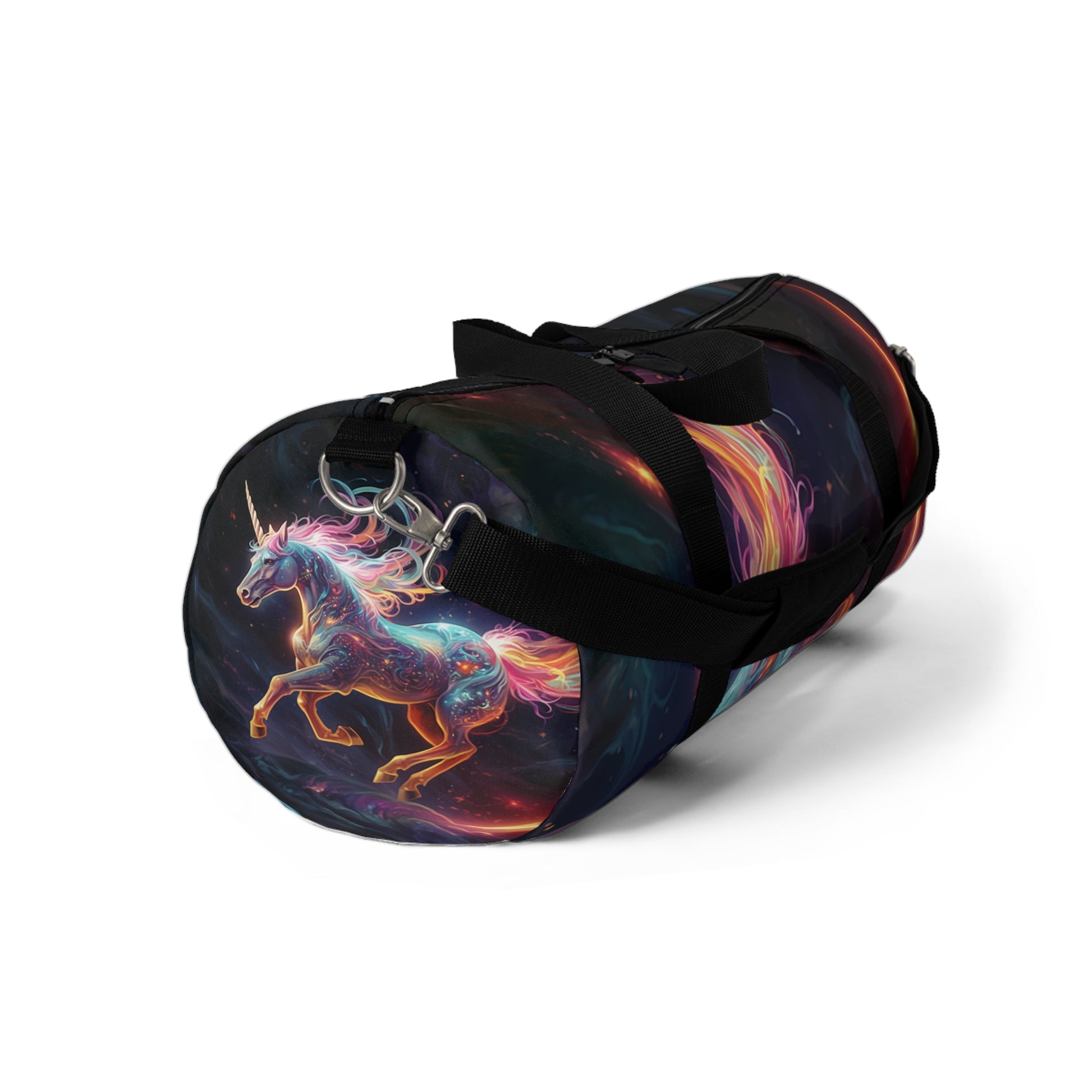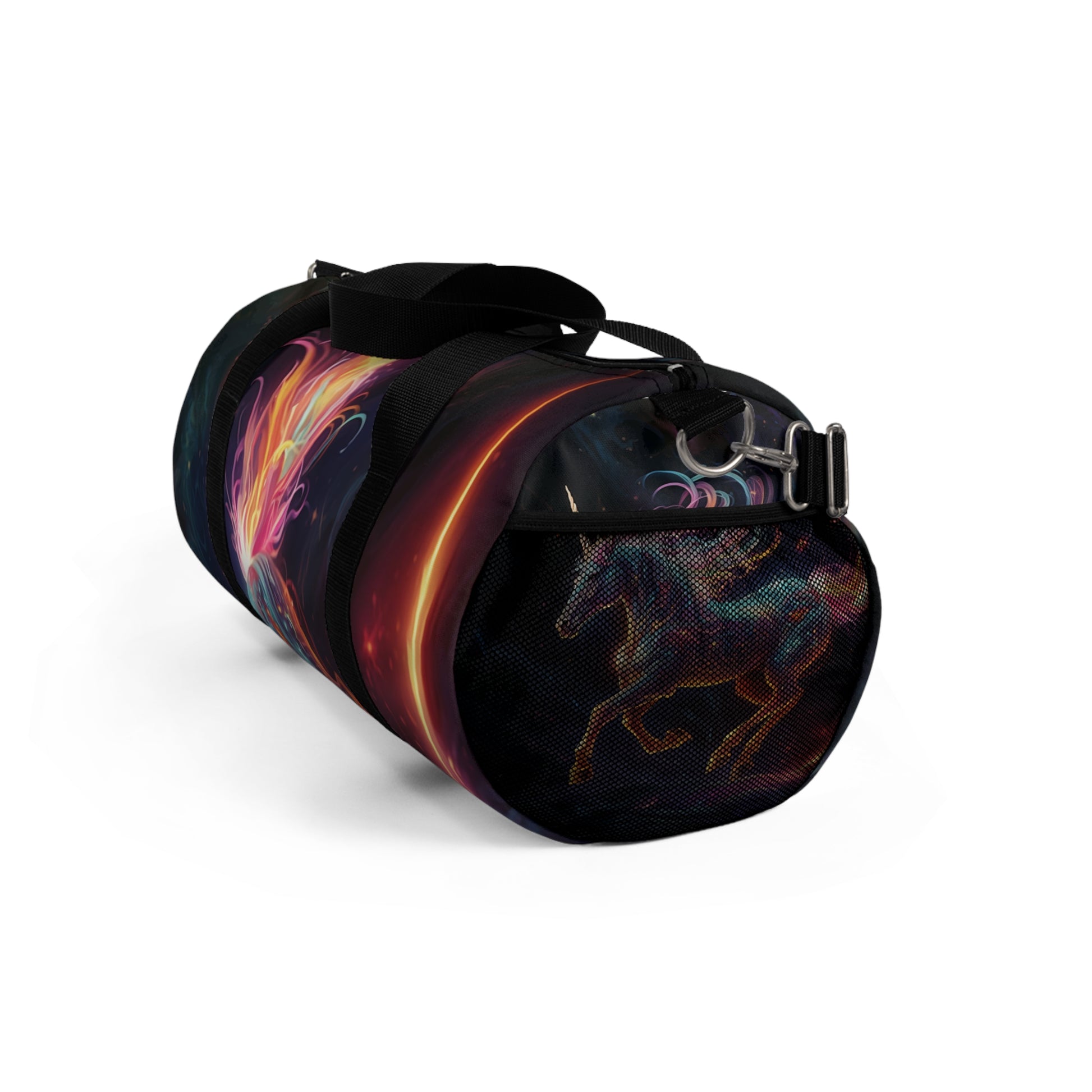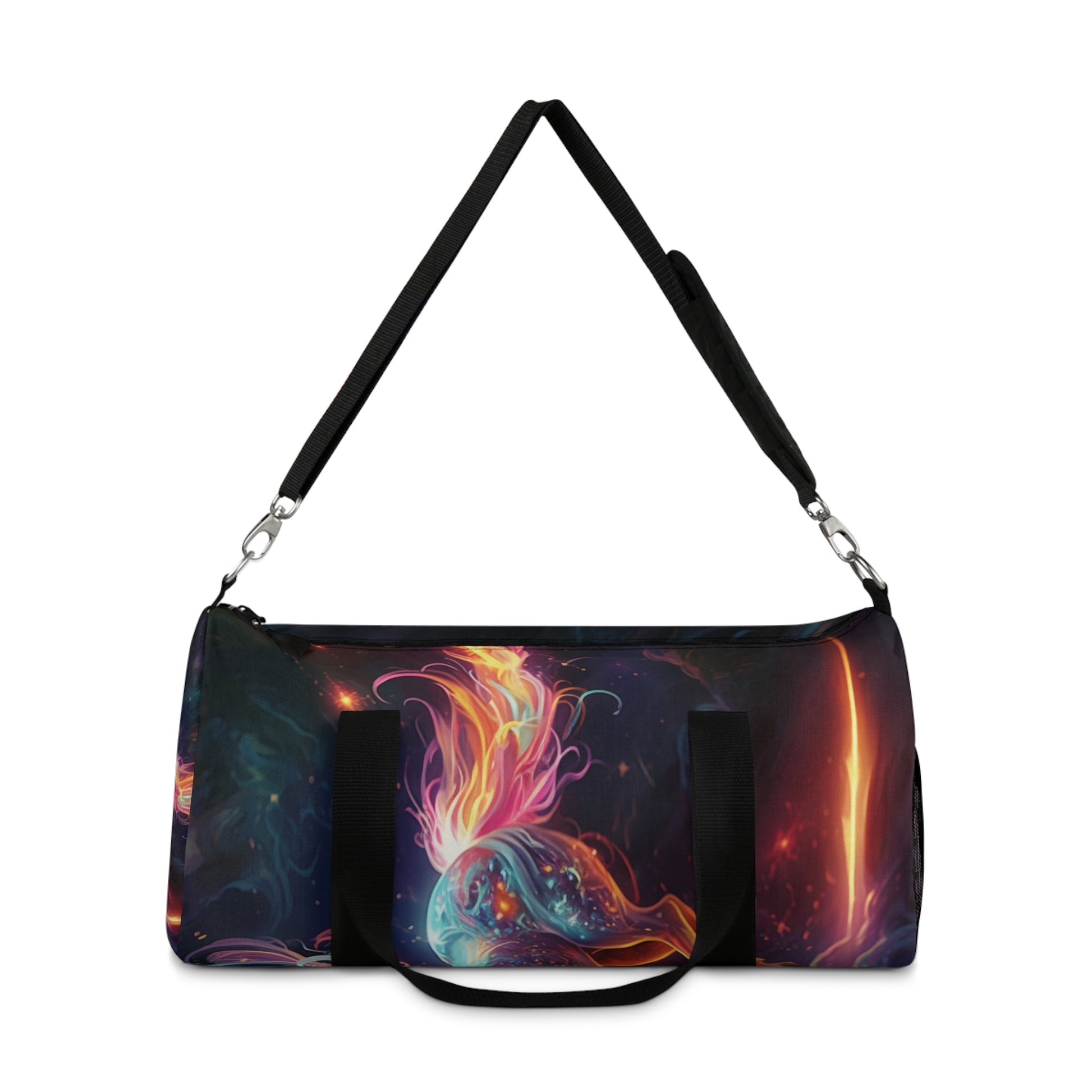 Get ready to carry your essentials with cosmic flair! Our Solar Eclipse Duffel Bag combines style and practicality for all your on-the-go adventures. Featuring a captivating solar eclipse print, this bag is a statement piece for astronomy lovers and anyone who appreciates unique designs. The lightweight, durable construction makes it perfect for the gym, day trips, or any travel need. Comfortable to carry by hand or over your shoulder, this duffel bag embodies a perfect blend of function and celestial style. Upgrade your travel essentials with the eye-catching Solar Eclipse Duffel Bag!