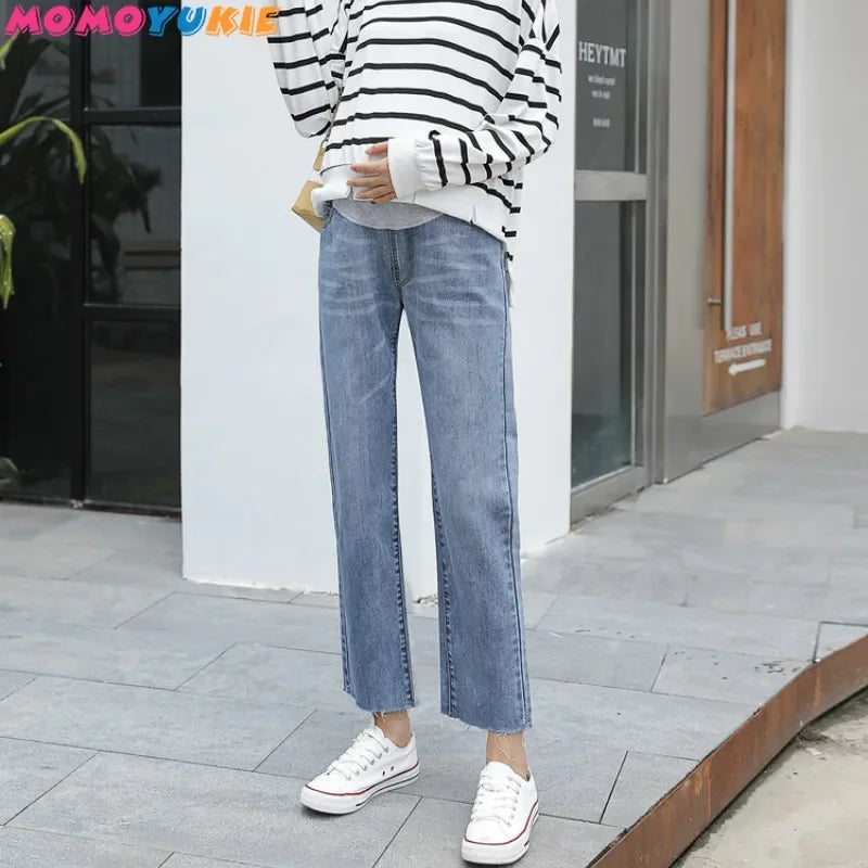 Vintage Washed Denim Maternity Jeans - Elastic Waist Belly Pants for Pregnant Women